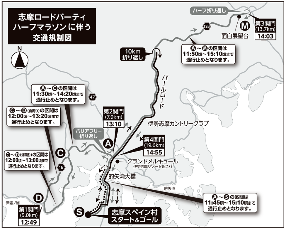 - 志摩磯部駅からグランドメルキュール伊勢志摩リゾート&スパを経由した志摩スペイン村までのルート(伊雑ノ浦北側)は、11:30~14:20ごろ通行止めになりますので、ご注意下さい。