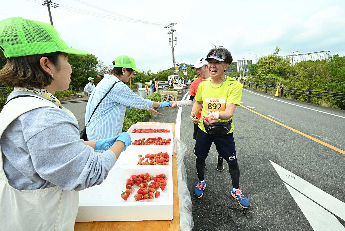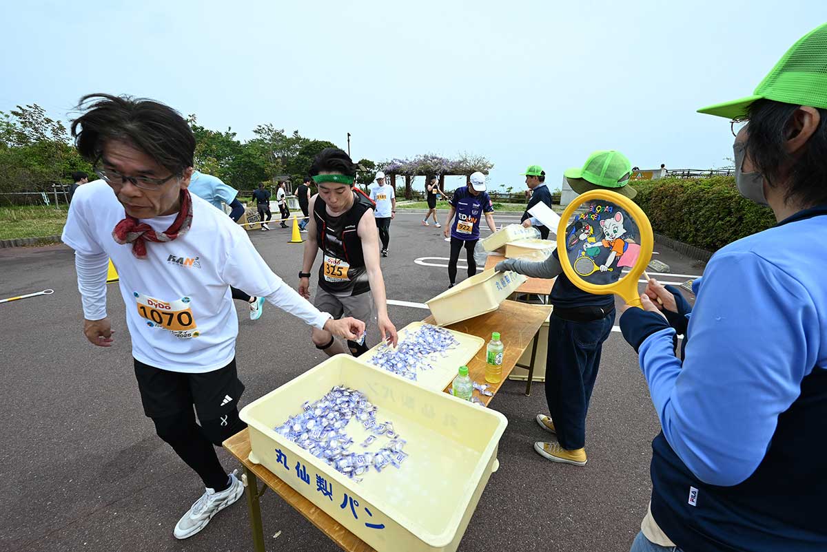 - エイドステーションには、水、スポーツドリンク、後半にはあおさパン、ミニメロンパン、バナナ、イチゴ、さわ餅、せんべい、塩タブ、チョコ、飴、ラムネを用意します。