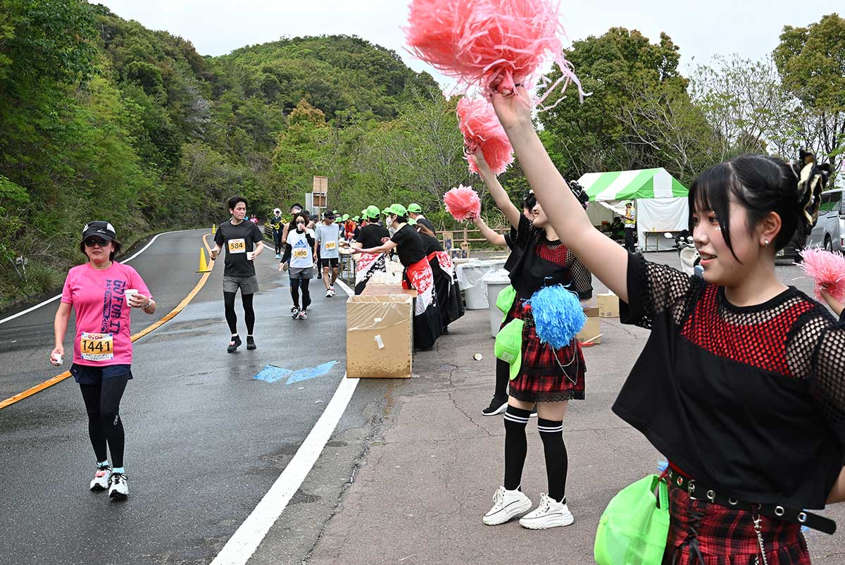 エイドステーションのボランティアから、選手に送られる熱いエール。きつい坂道を走る元気がもらえます。