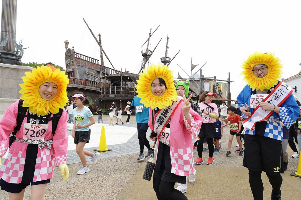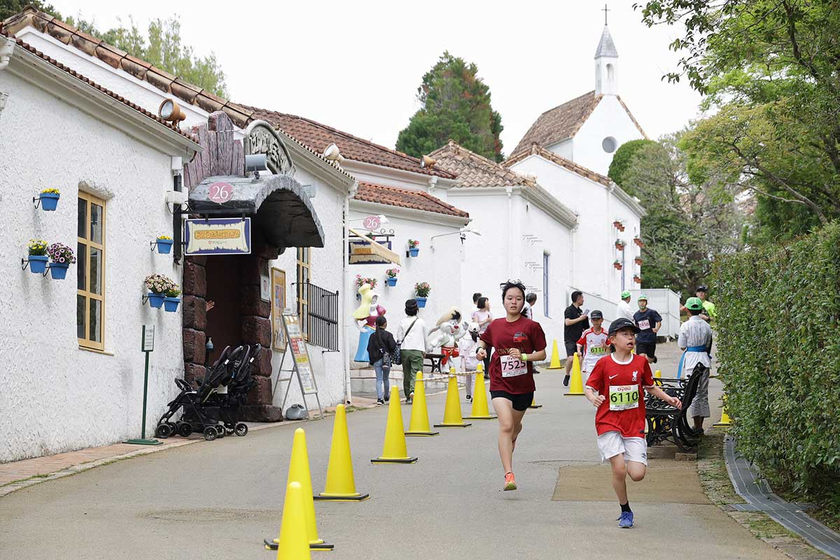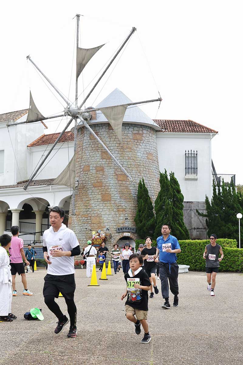 アトラクション「ドン・キホーテ冒険の旅」の建物の前を走るランナーたち。