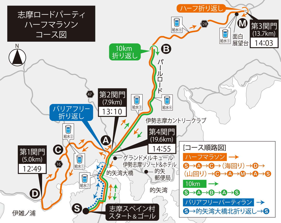 大会運営上、ハーフマラソンはコース上に収容関門を設けています。関門閉鎖後は、必ず収容車に乗車してください。※関門以外でも、著しく遅れた場合は競技を中止していただく場合があります。