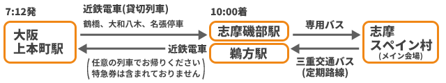 - 往路の大阪上本町駅から志摩磯部駅間のみ添乗員が同行します。それ以外、添乗員は同乗しません。